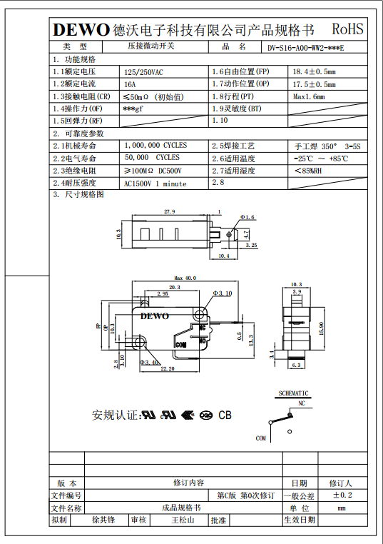DV-16-A00-WW2-200E型微動開關(guān)